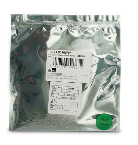 ** Caratteristiche Generali **Tipo di led: 3mm** Caratteristiche di Illuminazione **Colore: Bianco caldoIntensità luminosa: 5000mcdAngolo di emissione: 25°** Caratteristiche Elettriche **Corrente ingresso max: 20mATens. funzionamento DC: 3.2Vdc(3‑3.6Vdc)** Caratteristiche Sorgente Luminosa **Temp. Colore: 3000K** Caratteristiche Meccaniche **Numero di pin: 2Diametro: ø3mmColore corpo: Trasparente** Caratteristiche Termiche **Temp. di funzionamento: -10 / 70°C