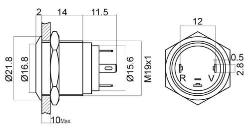 ** Caratteristiche Generali **Tempo di vita L70B50: 50000h** Caratteristiche di Illuminazione **Colore: Rosso-Verde** Caratteristiche Elettriche **Corrente ingresso max: 15mATens. funzionamento DC: 24Vdc** Caratteristiche Meccaniche **Numero di pin: 3Lunghezza: 27.5mmDiametro: ø22mmMontaggio: a pannelloForo incasso: ø19mmGrado di protezione: IP65Materiale corpo: Ottone nichelatoColore corpo: LucidoConnessioni: a saldare** Caratteristiche Termiche **Temp. di funzionamento: -10 / 40°C