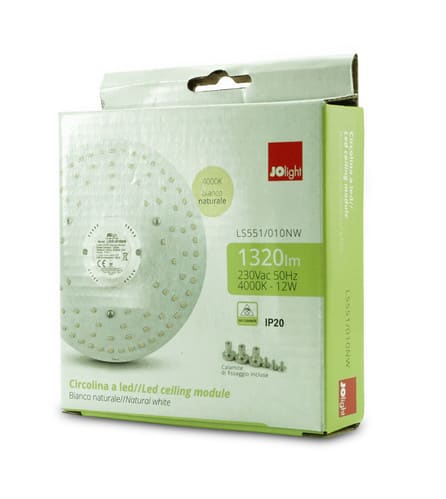 Circolina led con alimentatore incluso.** Caratteristiche Generali **Tempo di vita L70B50: 20000hNumero cicli di accensione: 10000 cicliFattore di sopravvivenza: 0.9Tipo di led: smd 2835Numero Led: 50Rischio fotobiologico: Esente** Caratteristiche di Illuminazione **Colore: Bianco naturaleFlusso: 1320lmCRI: 80Angolo di emissione: 120°Warm-up (60%): 0.2sFattore mantenimento flusso: 0.96Uniformità colore (SDCM): 6** Caratteristiche Elettriche **Classe energetica: EPotenza: 12WFattore di potenza PF: 0.55Fattore di sfasamento DF: 0.7Tens. funzionamento AC: 230VacTolleranza d'ingresso: ±10%Frequenza: 50-60HzDimmerabile: noClasse isolamento: IIAlimentatore: Esterno (incluso)** Caratteristiche Sorgente Luminosa **Temp. Colore: 4000K** Caratteristiche Meccaniche **Attacco: CavettoLunghezza: 35mmLarghezza: 120mmAltezza: 120mmDiametro: ø120mmGrado di protezione: IP20Diffusore: Nessuno** Caratteristiche Termiche **Temp. di funzionamento: -10 / 40°CContenuto Confezione-Modulo led- n3 calamite di fissaggio