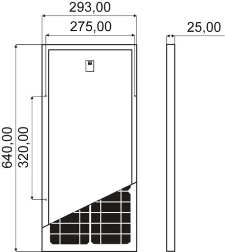 ** Caratteristiche Elettriche **Potenza: 27WpTensione Voc: 19.27VCorrente Isc: 1.71ATensione operativa (Vmp): 16.67VCorrente operativa (Imp): 1.62ATensione massima di sistema: 400VMassimo valore fusibile: 5A** Caratteristiche meccaniche **Tipo pannello: con corniceCornice: alluminio anodizzatoParte frontale: vetroSpessore vetro: 2.5mmIncapsulamento: EVALato posteriore: TPTScatola di giunzione: IP65Larghezza: 293mmLunghezza: 640mmSpessore: 25mmPeso: 1.95KgCapacità di carico: 5400PaDiametro di resistenza: 80Km/h: 25mm** Caratteristiche Celle **Tipo cella: MonoNumero di celle: 30Dimensioni cella: 83 x 55mm** Caratteristiche temperatura **Temp. nom. operativa (NMOT): 45°CCoeff. temp. Pmax: -0.35%/°CCoeff. temp. Voc: 0.28%/°CCoeff. temp. Isc: 0.04%/°CTemp. di funzionamento: -40 / 85°C