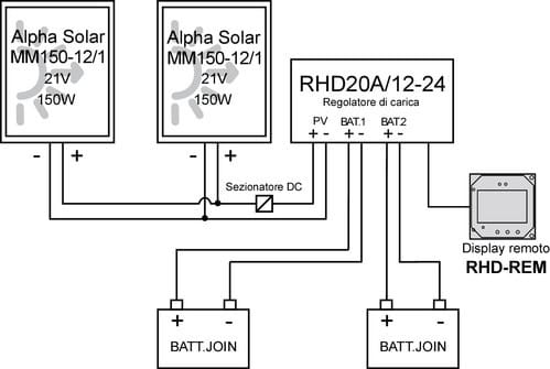 ** Caratteristiche generali **Display per regolatore di carica con gestione di due batterie.Indicazione delle impostazioni dell'impianto.Collegamento interno con negativo comune.Il display remoto RHD-REM consente di visualizzare i parametri del regolatore di carica RHD a doppia batteria.Può essere montato a parete oppure a incasso. Cavo di collegamento incluso.** Dati visualizzati ** (Valori istantanei)** Pannelli **- Tensione- Corrente- Corrente massima- Energia di carica- Frequenza di PWM- Eventuali anomalie** Batteria (1 e 2) **- Tensione- Tensione Minima- Tensione Massima- Temperatura- Eventuali anomalie