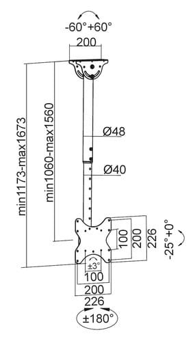 Installabile anche su soffitti inclinati: regolazione +60°-60°.Estensione da 1060-1560mm.** Caratteristiche Generali **Funzionalità: OrientabileTipologia montaggio: Da soffittoAdatto per tv da: 23"- 42"Compatibilità VESA Max: 200x200mmCompatibilità VESA: 100x100, 200x200, 200x100Estensione: Braccio singoloRotazione (Pivot): -3° +3°Inclinazione (Tilt): -25° +0°Orientamento (Swivel): -180° +180°Colore: Nero** Caratteristiche Meccaniche **Avanzamento TV: ManualeMateriale: AcciaioDistanza dal muro: 156cmPortata: 50KgBolla di livello: NoSistema di bloccaggio: NoGestione cavi: SiInnesto a baionetta: NoKit di montaggio: Incluso