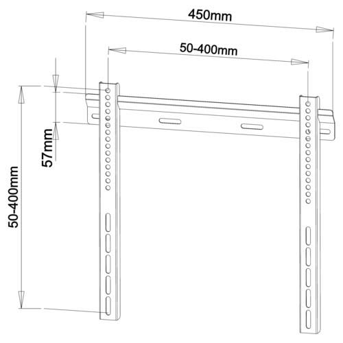 ** Caratteristiche Generali **Funzionalità: FissoTipologia montaggio: Da pareteAdatto per tv da: 23"- 55"Compatibilità VESA Max: 400x400mmCompatibilità VESA: 100x100, 100x150, 100x200, 150x100, 150x150, 200x100, 200x200, 300x200, 300x300, 400x200, 400x300, 400x400, 200x150, 300x400Estensione: NessunaRotazione (Pivot): 0°Inclinazione (Tilt): 0°Orientamento (Swivel): 0°Colore: Nero** Caratteristiche Meccaniche **Materiale: AcciaioDimensioni (WxH): 450mm x 410mmDistanza dal muro: 2.2cmPortata: 60KgPeso prodotto: 0.85KgBolla di livello: SiSistema di bloccaggio: NoGestione cavi: NoInnesto a baionetta: NoKit di montaggio: Incluso