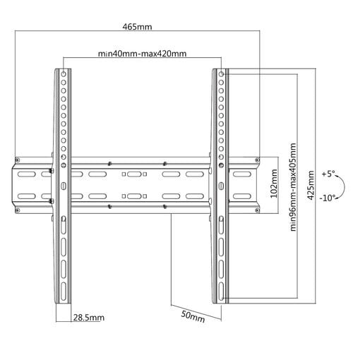 ** Caratteristiche Generali **Funzionalità: InclinabileTipologia montaggio: Da pareteAdatto per tv da: 32"- 55"Compatibilità VESA Max: 400x400mmCompatibilità VESA: 200x200, 300x200, 300x300, 400x200, 400x300, 400x400Estensione: NessunaRotazione (Pivot): 0°Inclinazione (Tilt): -10° +5°Orientamento (Swivel): 0°Colore: Nero** Caratteristiche Meccaniche **Avanzamento TV: ManualeMateriale: AcciaioDimensioni (WxH): 465mm x 425mmDistanza dal muro: 5cmPortata: 35KgBolla di livello: NoSistema di bloccaggio: NoGestione cavi: NoInnesto a baionetta: NoKit di montaggio: Incluso