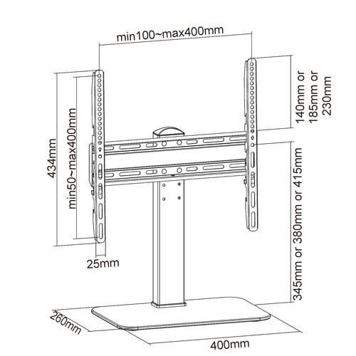 ** Caratteristiche Generali **Tipologia montaggio: Da scrivaniaAdatto per tv da: 32"- 55"Compatibilità VESA Max: 400x400mmCompatibilità VESA: 200x200, 300x200, 300x300, 400x200, 400x300, 400x400Estensione: NessunaRotazione (Pivot): 0°Inclinazione (Tilt): -10° +10°Orientamento (Swivel): 0°Colore: Nero** Caratteristiche Meccaniche **Avanzamento TV: ManualeMateriale: AcciaioPortata: 40KgBolla di livello: NoSistema di bloccaggio: NoGestione cavi: SiInnesto a baionetta: NoKit di montaggio: Incluso