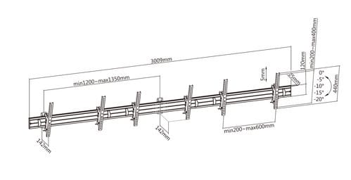 Questo supporto da parete per tre display da 45"a 50"consente di creare un pannello menu perfettamente allineato per offrire ai tuoi clienti un'esperienza di visualizzazione coinvolgente e sempre aggiornata. Il sistema di montaggio modulare semplifica la fase di installazione.** Caratteristiche Generali **Funzionalità: InclinabileTipologia montaggio: Da pareteAdatto per tv da: 45"- 50"Compatibilità VESA Max: 600x400mmCompatibilità VESA: 200x200, 400x200, 300x300, 400x400, 600x400Estensione: NessunaColore: Grigio** Caratteristiche Meccaniche **Materiale: Alluminio e acciaioDimensioni (WxH): 3009mm x 440mmDistanza fori: 600x400mmPortata: 50Kg