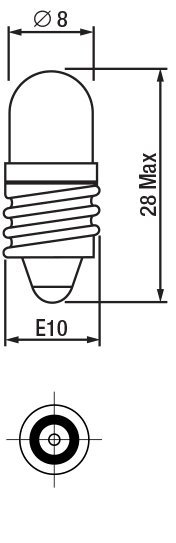 Segnalatore LED. Chip del LED protetto da lente trasparente in resina epossidica, Ø 8 mm. Anello in plastica dello stesso colore della luce emessa dal LED. LED bianco 12V E10