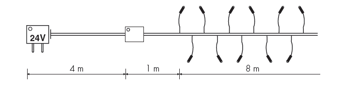 Ghirlanda lineare con 180 led ultra luminosi e con gioco luci, per uso all’esterno ed all’interno. Costruita secondo la norma EN60598-2-20-A2:2004. Gioco luci elettronico stagno 8 effetti. Trasformatore Plug-in IP 44 . Cavo 26AWG verde. I led ultra luminosi consentono: Bassissimi consumi. Alta luminosità. Durata lunghissima. Nessun riscaldamento e quindi grande risparmio energetico. Lunghezza totale: 10m