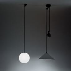 Rosone in resina termoplastica e metallo verniciati; contrappeso in resina termoplastica trasparente; diffusore conico in metallo. Versione con saliscendi con contrappeso. Codice cono in metallo: A089860 Lampada con diffusori intercambiabili. Colore: Grigio scuro metallizzato.