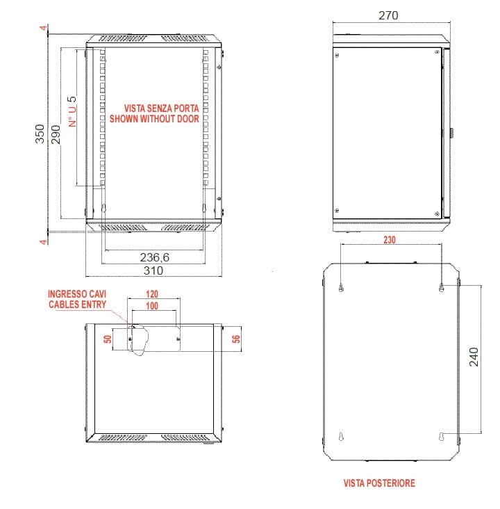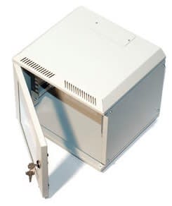Armadio mini rack 10"per networking, nato per piccole installazioni. Può essere installato a muro. I montanti 10"sono regolabili in profondità, i pannelli laterali e la porta sono asportabili. La porta garantisce un'apertura di 180°. Contenitore, portae pannelli in acciaio verniciato RAL 7035. Montanti 10"in acciaio zincato.