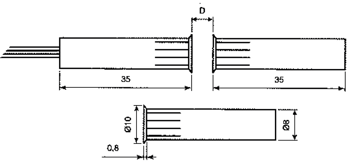 Contatto magnetico cilindrico in termoplastico. Adatto per porte e finestre in legno e PVC. Connessione a filo. Con loop filo antimanomissione (tamper). D max (non su ferro): 15mm. Tipo di contatto: NC. Corrente max: 1A. Potenza max:10W. N° fili: 4. Lunghezza cavo: 0.3m. Montaggio ad incasso. Ampia distanza di intervento.
