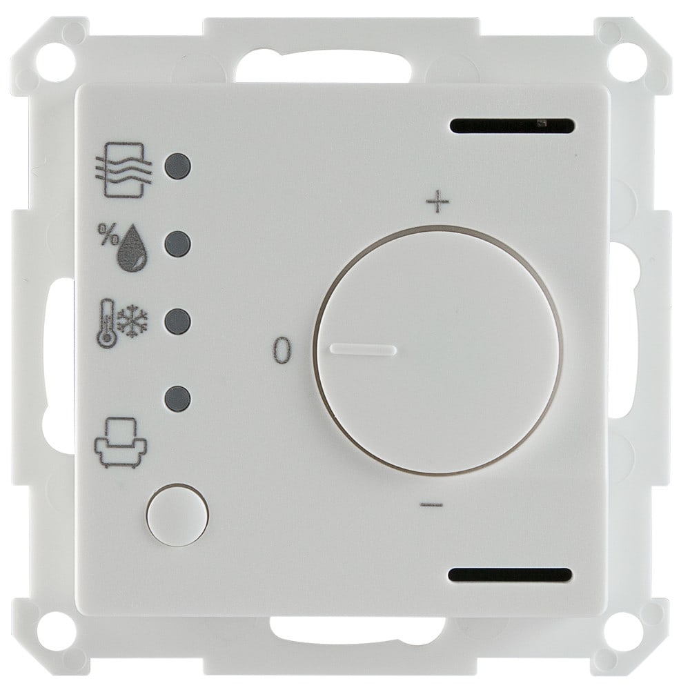 Regolatore di temperatura e sensore di qualita dell'aria (VOC) per bus KNX, Controllo della temperatura: regolatore PI (continuo), controllo% a 2 punti, commutazione a 2 punti, PWM, Curve di temperatura preimpostate per diversi sistemi di riscaldamento /raffrescamento, Diverse modalita di funzionamento prioritarie (comfort, standby, eco, antigelo / protezione dal calore), Determinazione del punto di condensa, Indicatore riscaldamento / raffreddamento (rosso / blu), Controllo della qualita dell'aria: regolatore PI (continuo), controllo a 2 punti%, commutazione a 2 punti, Metodo di misurazione qualita dell'aria VOC, emissione VOC o CO2, Controllo dell'umidita: regolatore PI (continuo), controllo% a 2 punti, commutazione a 2 punti, Regolazione dei valori di controllo tramite manopola o oggetto di comunicazione, Indicatore (semaforo) per la qualita dell'aria e l'umidita (verde, giallo, rosso), Adatto per serie di interruttori 55x55, Adattatore per interruttori 63x63 incluso