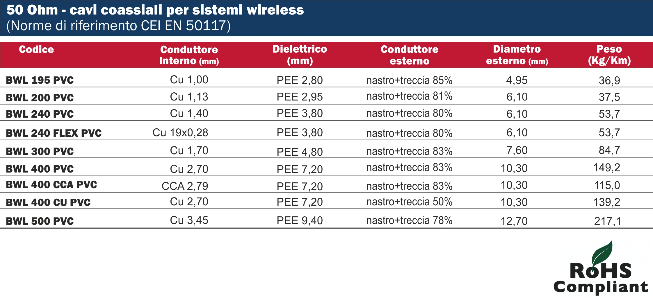 BWL 400 E PVC Cavo coassiale 50 Ohm per trasmissione RF (Wireless Wi-Fi) Idoneo alla posa in coesistenza con cavi energia 230V 400V. Realizzato con conduttore in reme, doppia schermatura (nastro piu treccia) e guaina in PVC. Euroclasse Eca Imballo:matassa in termoretraibile da 100m