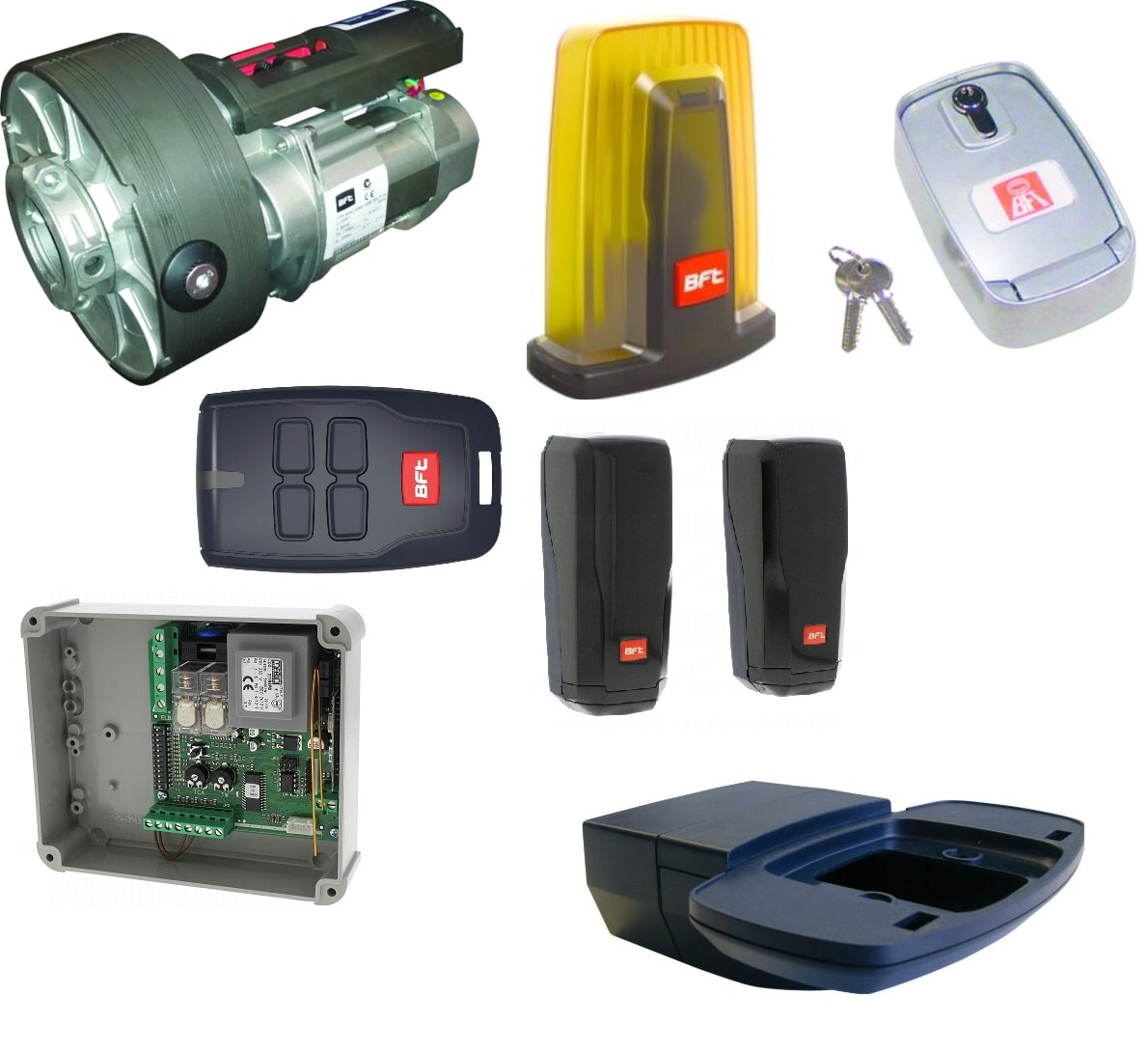 Kit per serrande. Il kit comprende: 1 operatore per serrande con puleggia portamolle diametro 200-220 mm. Coppia massima 130 Nm e potenza assorbita pari a 400 W. Sblocco con cavo in acciaio e pomello per elettrofreno. (cod. P910042 00002); 1 cassaforte da muro per sblocco a cavo in acciaio e comando elettrico (cod. N574039); 1 trasmettitore 12V a quattro canali 433MHz rolling code (cod. D111906); 1 quadro di comando 230 V max per un operatore per tapparelle o serrande (cod. D113717 00002); 1 coppia di fotocellule autoallineanti. Portata 30 m. Alimentazione 24 V ac/dc. (cod. P111526); 1 lampeggiante con antenna integrata per motori alimentati in 230V (cod. D113748 00002); 1 supporto a muro per lampeggiante serie B LTA (cod. P123025)