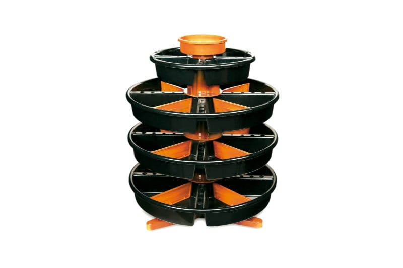 Caratteristiche: ? Dotato di un contenitore portaminuteria superiore (diametro 145 mm) e 4 vassoi girevoli: 1 diametro 305 mm 3 diametro 445 mm ? Fornito completo di 12 divisori applicabili all'interno dei 3 vassoi girevoli grandi per ottenere fino a 8 scompartimenti per piano ? 445x445x550 mm - ? 3,4 kg