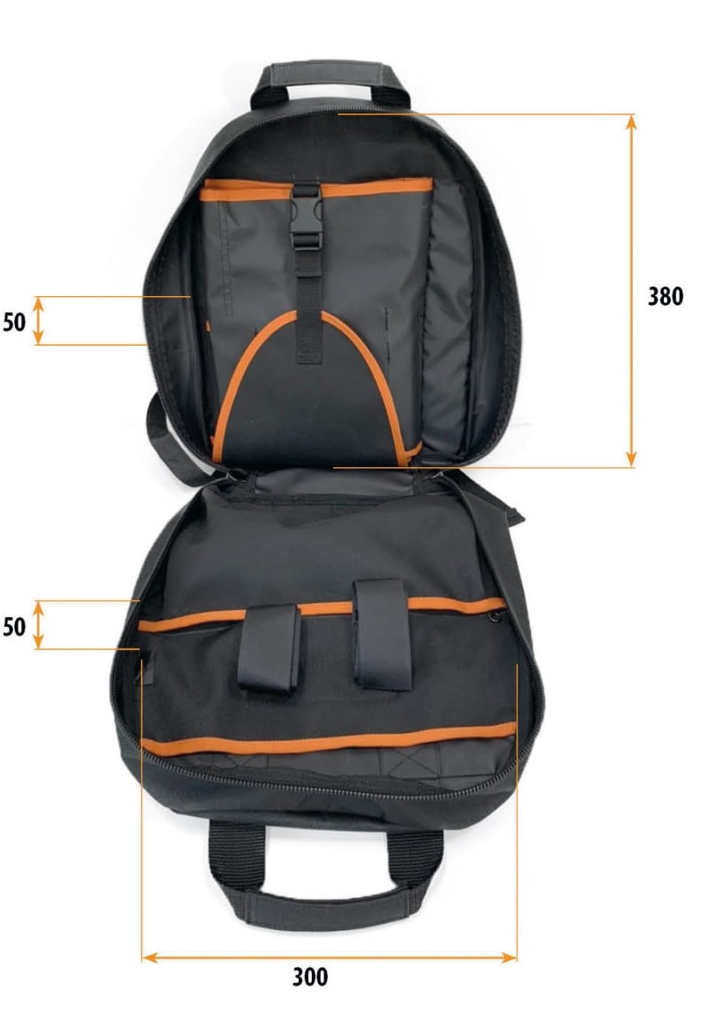 Caratteristiche: ? Doppia maniglia sulla sommita centrale dello zaino per una presa sicura e bilanciata? Due ampie tasche frontali? Due capienti tasche interne e 2 fasce aggiuntive con velcro ? Pratica busta avvolgibile interna, composta da 4 pannelli portautensili ? Spallacci imbottiti rinforzati e regolabili? Carico massimo 15 Kg ? 310x120x390 mm - ? 0,9 Kg