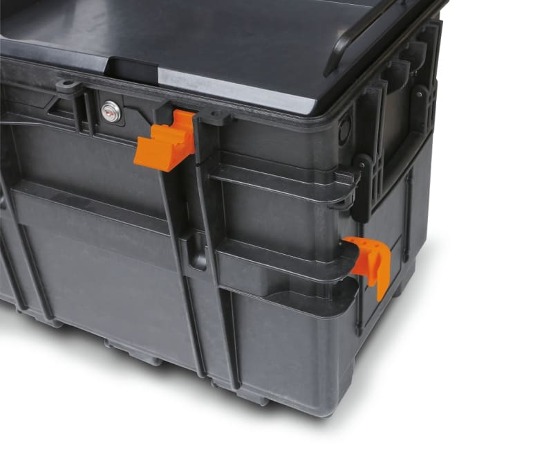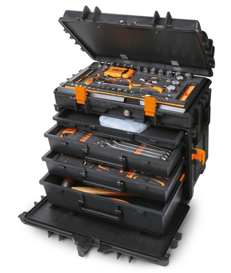 ? Struttura in polipropilene a iniezione che garantisce elevata resistenza agli urti.? La parte anteriore, protetta dal coperchio frontale, ospita da 4 cassetti 470x255 mm estraibili:1 cassetto altezza 30 mm2 cassetti altezza 60 mm1 cassetto altezza 90 mm? Serratura centralizzata frontale consente di chiudere contemporaneamente i due coperchi, quello superiore e quello frontale. ? Due maniglie laterali? 4 robuste ruote posteriori ? Vassoio superiore removibile ? Pannello portautensili integrato nel coperchio? 3 vaschette porta minuteria incluse? Targhetta identificativa portanome? Predisposizione per la chiusura con lucchetto TSA? 585x390x457 mm - ? 10 kg
