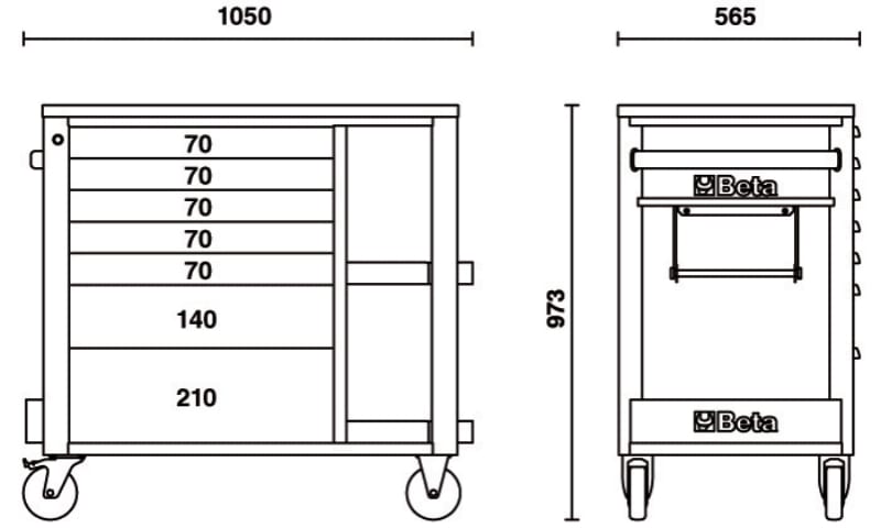 Cassettiera portautensili Beta con 7 cassetti da 588x367 mm,montati su guide telescopiche a sfera:? 5 cassetti altezza 70 mm? 1 cassetto altezza 140 mm? 1 cassetto altezza 210 mmCaratteristiche:? Piano dei cassetti protetto da tappetini di gomma espansa? Quattro ruote ? 125 mm di cui 2 fisse e 2 girevoli con freno? Serratura centralizzata frontale? Capacita di carico statico pari a 1.100 kg? Piano di lavoro in legno multistrato con foriper la collocazione di una morsa(1599F/100- 1599GI/100 da ordinare separatamente)? Vano laterale con ripiano regolabile in altezza? Portacarta integrato? Doppio portaflaconi posteriore? Portaflaconi laterale integrato