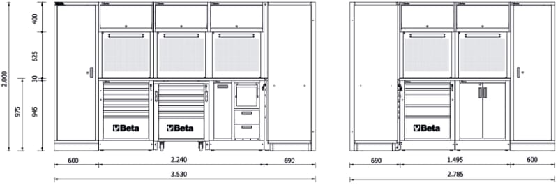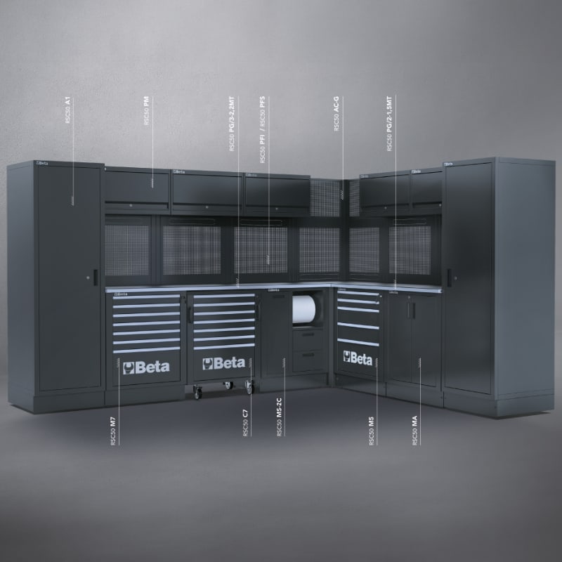 Combinazione composta da:? 1 Piano di lavoro da 2.240x630 mm (RSC50 PG/3-2,2MT)? 1 Piano di lavoro da 1.495 mm (RSC50 PG/2-1,5MT)? 1 Modulo fisso con 7 cassetti (RSC50 M7)? 1 Cassettiera mobile con 7 cassetti (RSC50 C7)? 1 Modulo fisso di servizio con 2 cassetti (RSC50 MS-2C)? 1 Angolo completo autoportante (RSC50 AC)? 1 Modulo fisso con 5 cassetti (RSC50 M5)? 1 Modulo fisso con 2 antine (RSC50 MA)? 5 pensili a muro (RSC50 PM)? 5 pannelli forati portautensili superiori (RSC50 PFS)? 5 pannelli forati portautensili inferiori (RSC50 PFI)? 5 coppie montanti DX-SX (RSC50 P/2MDX-SX)? 2 Armadi ad 1 anta (RSC50 A1)