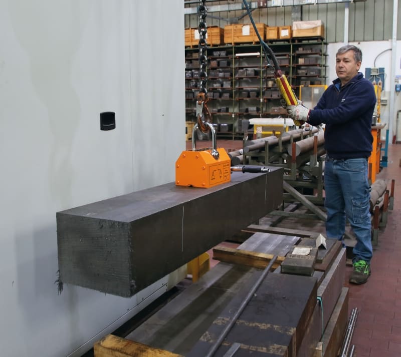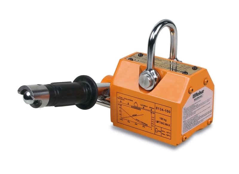 I sollevatori magnetici permanenti ROBUR sono attrezzature compatte, robuste ed affidabili, ampiamente utilizzate in fabbriche, magazzini, banchine portuali e in strutture di trasporto. Progettate in conformita alla norma europea EN13155, queste attrezzature sono idonee a sollevare e movimentare materiali in ferro magnetico come stampi, lamiere, tubi, raccordi, travi e barre.Il magnete permanente e realizzato in una lega al Neodimio Ferro e Boro, in grado di esercitare una forza attrattiva estremamente elevata, tanto da essere definita ;supermagnetica;. Non e richiesta tensione elettrica, dunque possono essere utilizzati anche in luoghi in cui non sia disponibile l'allacciamento. Un solo operatore puo sollevare, trasportare e rilasciare il caricofacilmente, agendo sulla leva di manovra: quando viene attivata la leva, sulla posizione ON, un meccanismo a molla la blocca, mantenendo il magnete attivo e prevenendo un disattivazione accidentale. NOTE TECNICHE:? Non rimuovere mail la leva dalla posizione ON finche il carico non si trova a terra.? L'efficienza massima e garantita con materiali a basso tenore di carbonio(es. S235, S275, S355)? Non utilizzare con materiali amagnetici o parzialmente magnetici (es. acciaio inox Aisi 304)? Controllare sempre il traferro e in funzione di esso ridurre la portata o valutarne l'impossibilita di utilizzo.? Verificare che tra il magnete e il carico non siano presenti pellicole protettive, sporco, grasso, olio, ecc e nel caso rimuoverle.? Controllare sempre lo spessore della superficie, e in funzione di essa ridurre la portata o valutarne l'impossibilita di utilizzo.? Per superfici tonde e sempre necessario ridurre la portata come indicato sul manuale. Dati tecnici: ? Coefficiente di sicurezza: 3 ? Piastra di identificazione seriale Certificati disponibili: ? Certificato del Fabbricante ? Dichiarazione di Conformita CE ? Rapporto di Prova tipo 2.2 UNI EN10204 ? Manuale d'uso e manutenzione