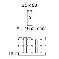 Canalette in PVC autoestinguente per il cablaggio di quadri elettrici, progettate per un'installazione sicura e ordinata. Dotate di coestruso morbido giallo sulle lamelle, misurano b25 x h80 mm con modulo 20 mm (feritoria 8 mm, lamella 12 mm). Conformi alla norma UL94 V0 e resistenti al filo incandescente fino a 960 °C (GWT EN 60695-2-11). Colore grigio RAL 7030, lunghezza 2 m, complete di coperchio.