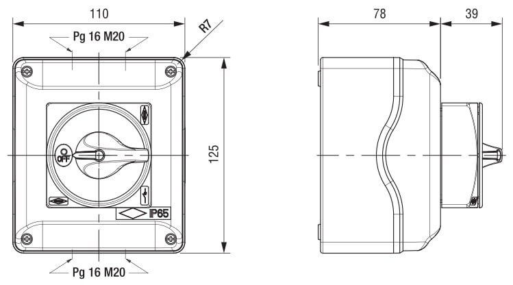 Cassetta in ABS IP65 con comando frontale e blocco coperchio in on. Mostrina grigia 67x67mm, manopola nera lucchettabile (max 3 lucchetti)