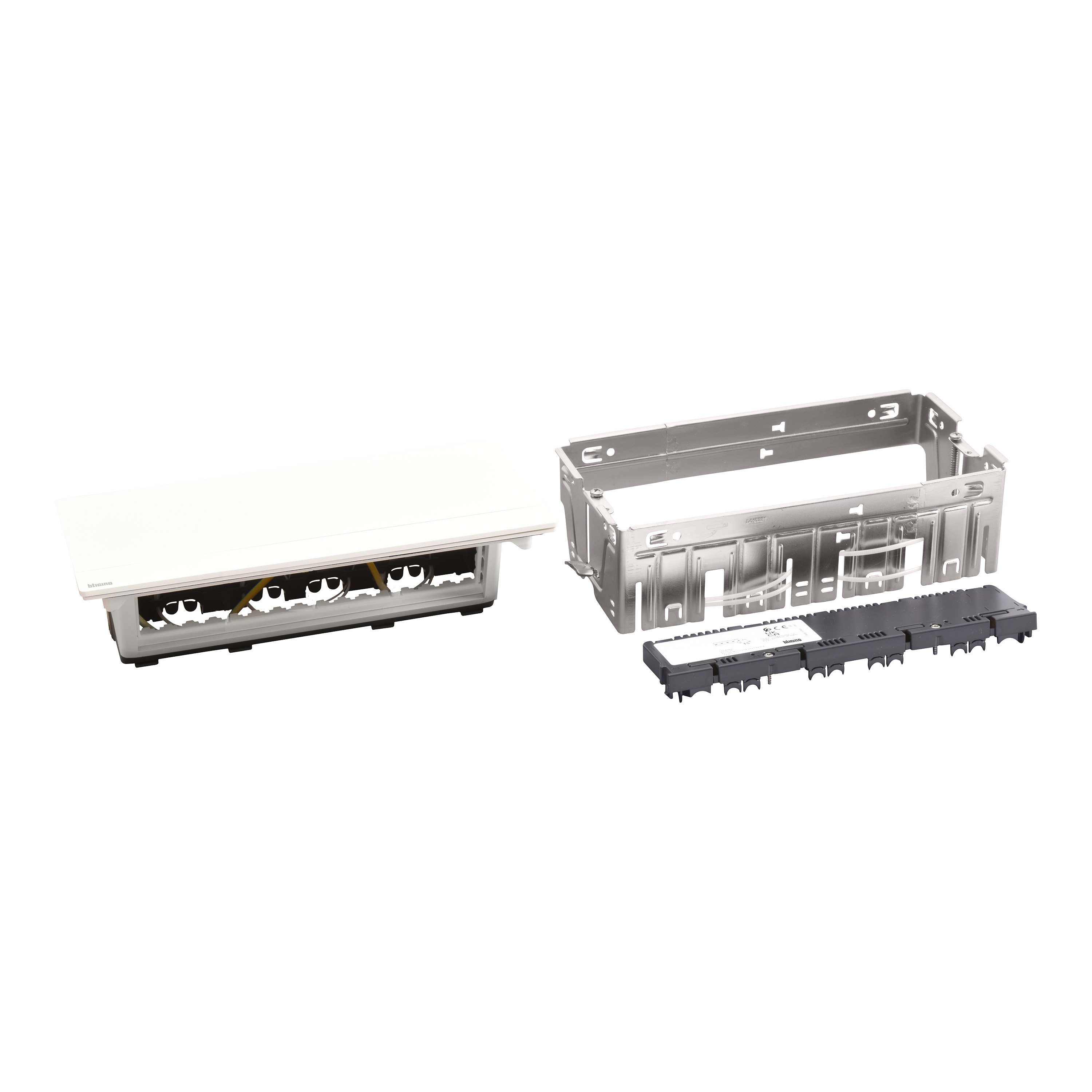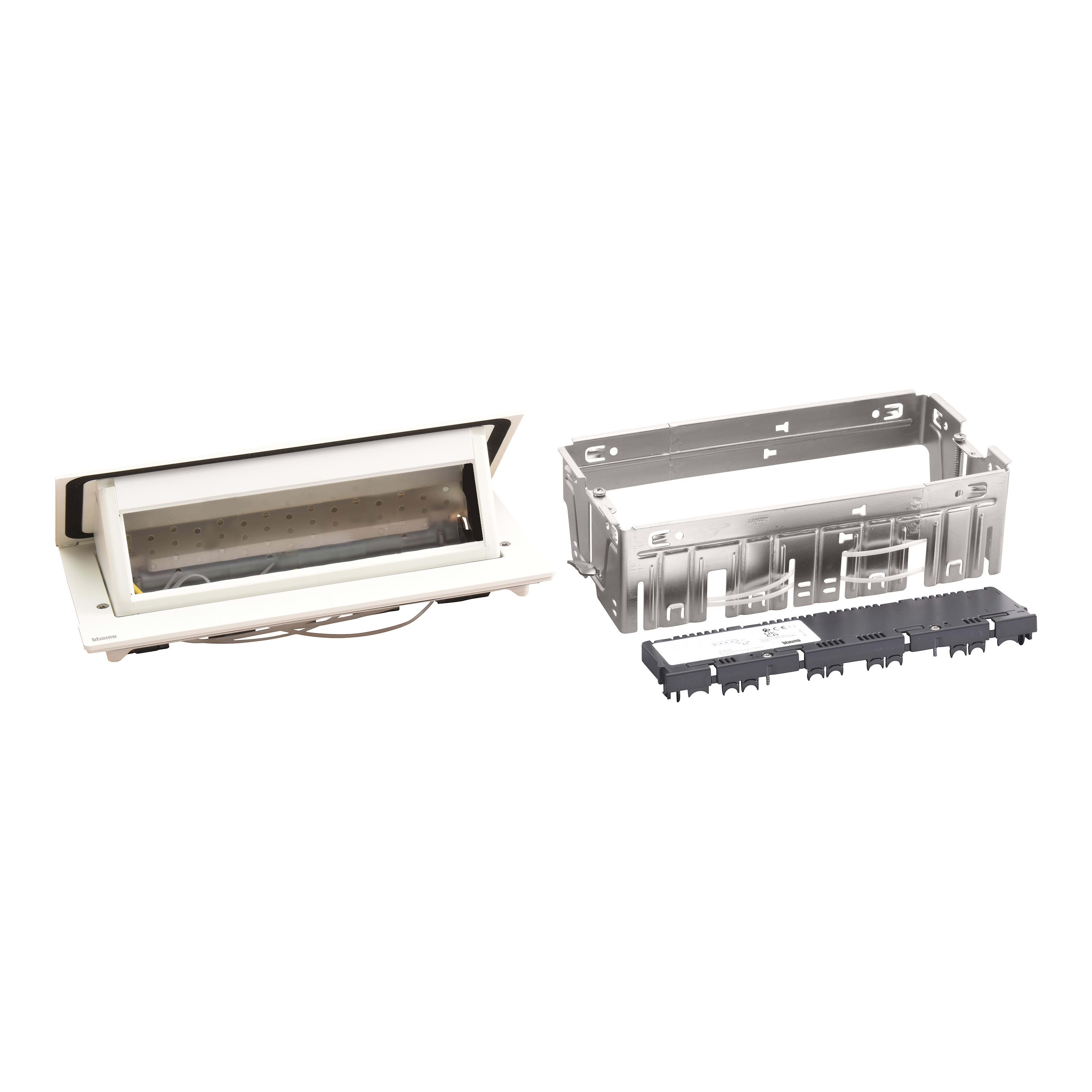 Pop-up per uffici e sale riunioni. 8 moduli - Finitura coperchio Bianco. Per il montaggio a incasso nei mobili, compatibile con spessore del tavolo da 15 a 40 mm. Materiale metallo. Pellicola protettiva. Da equipaggiare con le funzioni MatixGO.