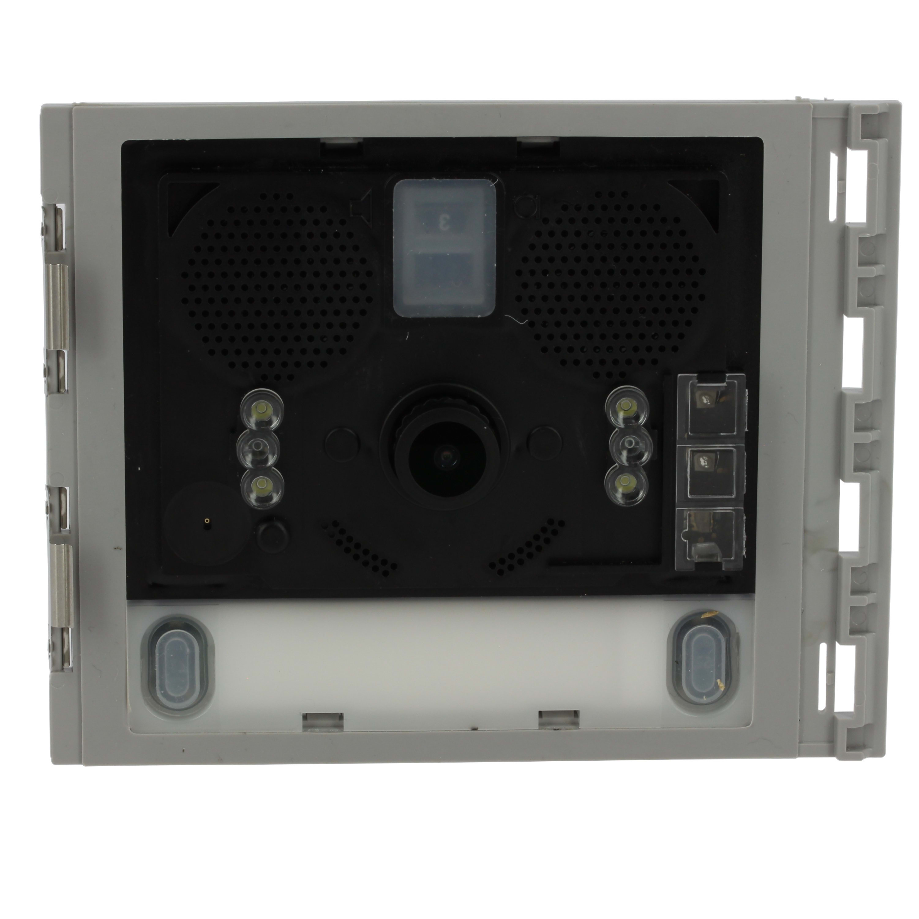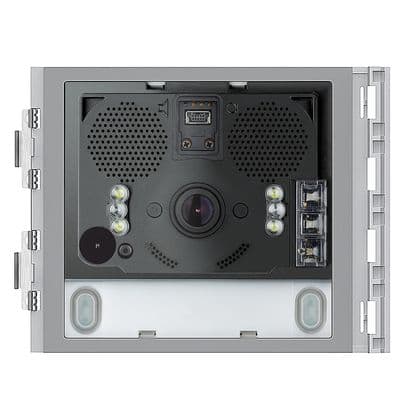 Modulo audio video Sfera per la realizzazione di impianti video a colori 2 FILI. Dotato di telecamera Alta Qualità da 5 MP grandangolare con filtri digitali e LED bianchi per illuminazione del campo di ripresa. ll segnale video viene trasmesso ai videocitofoni tramite codifica PAL su tecnologia SCS BUS 2 Fili. Regolazioni volume altoparlante e microfono. Gestisce fino ad un massimo di 98 chiamate a pulsanti utilizzando moduli pulsanti su doppia fila aggiuntivi. Angolo di visione orizzontale (119°),angolo di visione verticale (92°).Consente l’attivazione di una elettro serratura collegata direttamente ai morsetti S+ ed S- (18 V 4 A impulsivi - 250 mA mantenimento su 30 Ohm max) ed il collegamento di un pulsante apriporta locale sui morsetti PL.Predisposto per alimentazione supplementare. Dotato di LED frontali per la segnalazione dello stato di funzionamento: apriporta, comunicazione attiva, chiamata inoltrata e sistema occupato. Sensore ottico integrato per l’accensione della retroilluminazione notturna. Da completare con gli specifici frontali di finitura Sfera New e Sfera Robur. Il dispositivo deve essere configurato fisicamente oppure tramite PC e software specifico - scaricabile gratuitamente dal sito www.homesystems-legrandgroup.com.