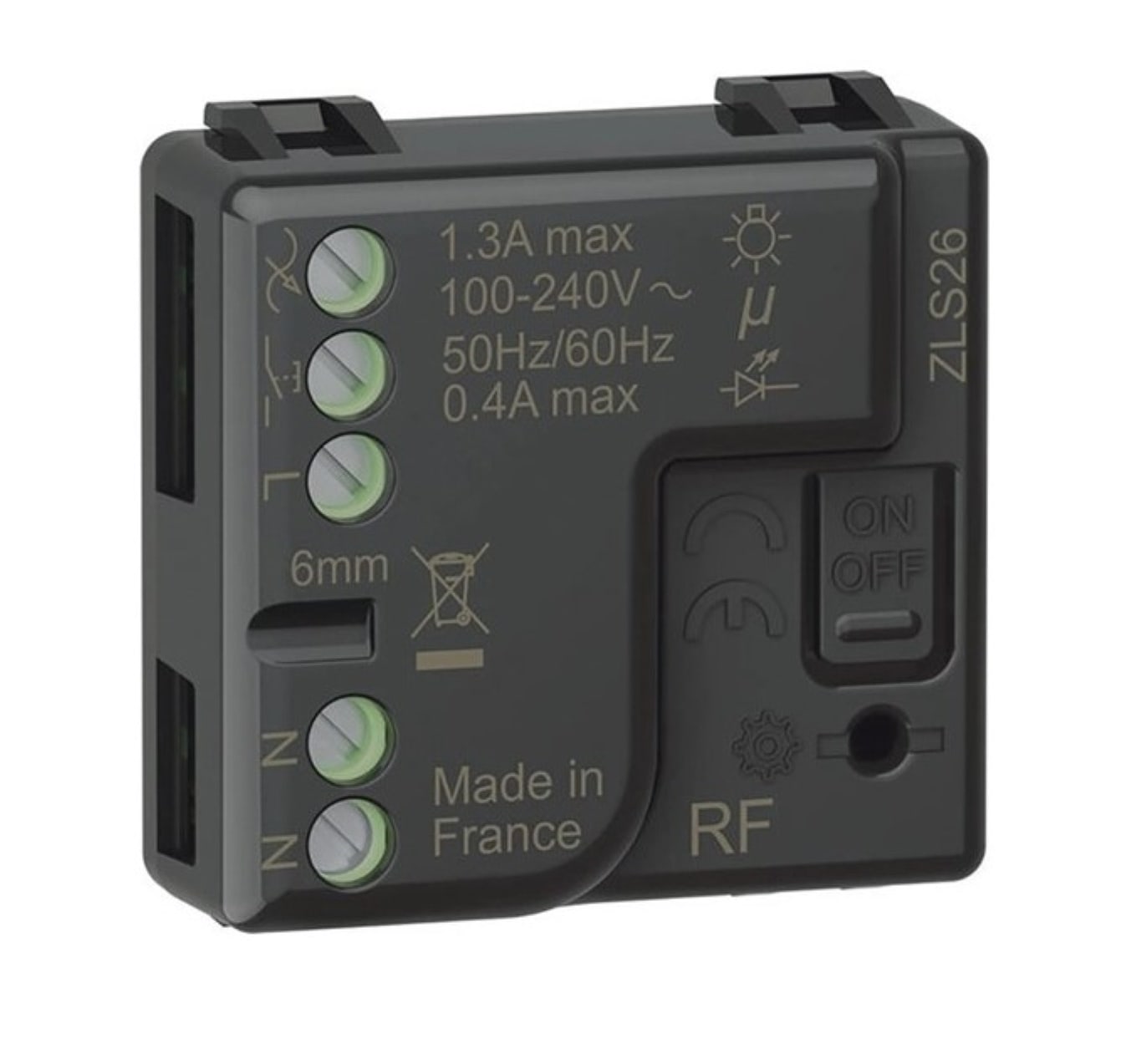 Relè luci connesso. Permette di controllare le luci localmente o da remoto. È compatibile con tutti i carichi con potenza massima di 300 W. Può essere collegato a uno o più pulsanti tradizionali o associato ad uno o più comandi wireless. Si installa comeun relè tradizionale nella scatola da incasso (dietro il pulsante) o in scatole di derivazione. Attenzione: è necessaria la connessione al neutro. Alimentazione 110-230 Va.c.