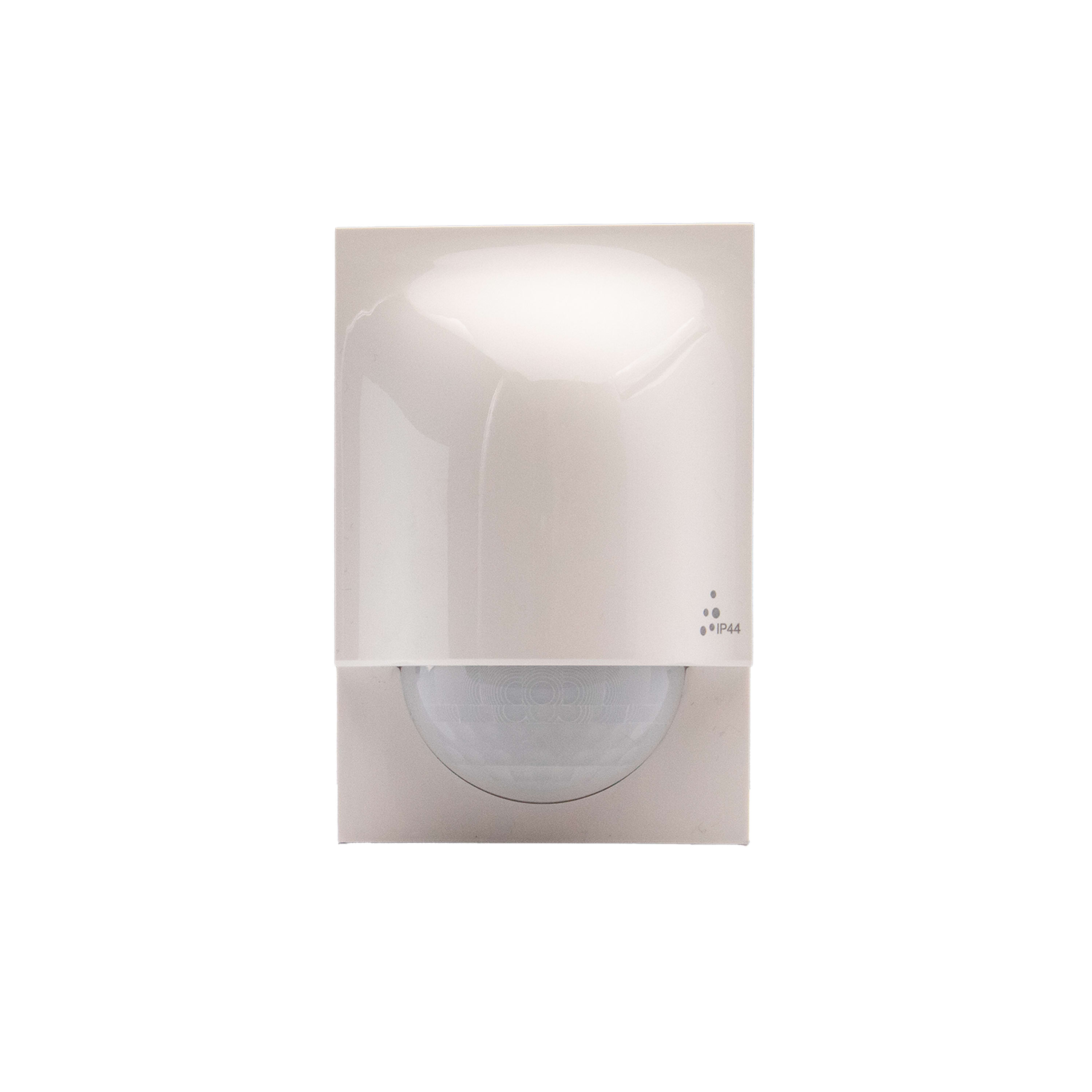 Sensore connesso di movimento, colore bianco, permette di controllare uno o più dispositivi connessi per il comando di luci. Rilevazione ad infrarossi con angolo di 140°. Distanza del sensore regolabile da 2 a 8 m.Temporizzazione per ritardo spegnimento regolabile da 1 a 30 minuti e soglia di luminosità da 1 a 1000 lux. Test possibile con ritardo di 5 sec Altezza di montaggio consigliata: 2,5m. Distanza ottimale tra 2 rilevatori: 6 m. Per uso interno ed esterno (IP44).Alimentazione a batteria. Fornito con 2 batterie AA da 1,5 V.