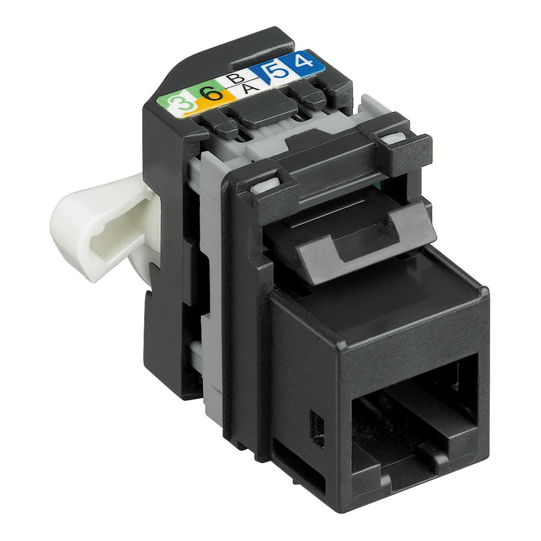 Connettori RJ45 con attacco universale keystone - connessione ad incisione d’isolante senza di attrezzi - per cavo U/UTP 22÷24 AWG a 4 coppie 100? - conforme alla normativa EN 50173-1 e EIA/TIA 568 A/B - non installabile su pannelli di permutazione - colore nero