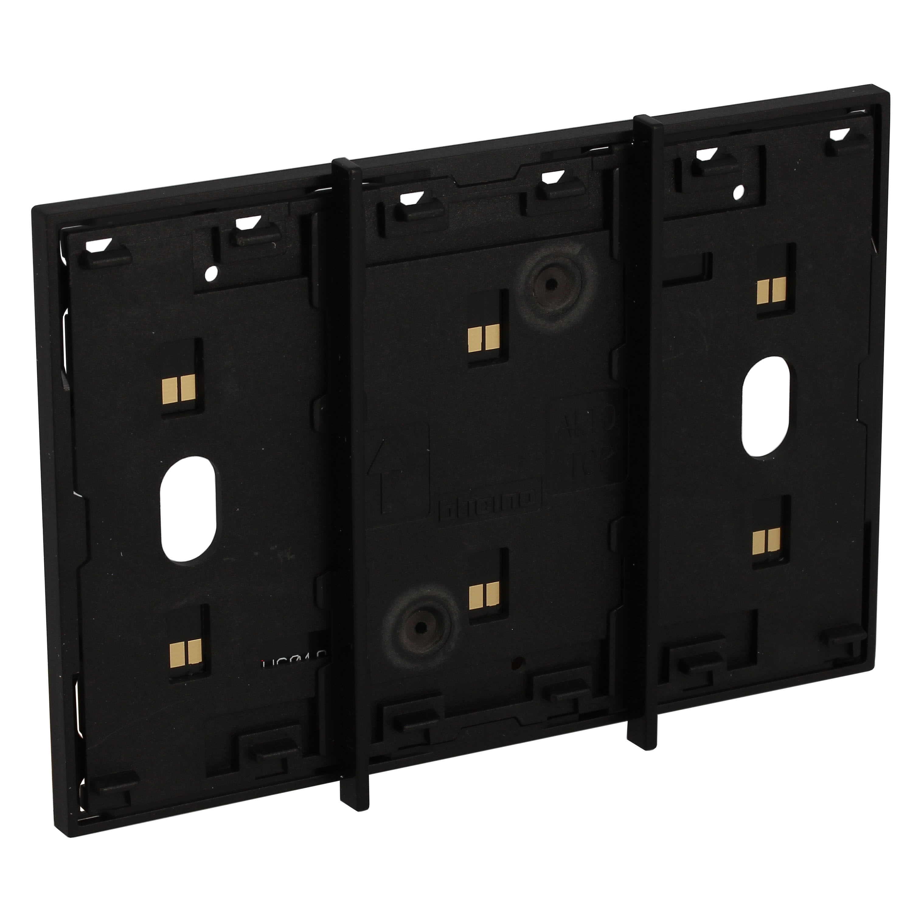 Frame elettrificato con barrette estetiche (rimovibili) di divisione tra i comandi. Per l’installazione di max. 3 comandi digitali o cover art. KW/KG/KM8100. Installazione in scatola da 3 moduli con supporto K4703. Colore nero.