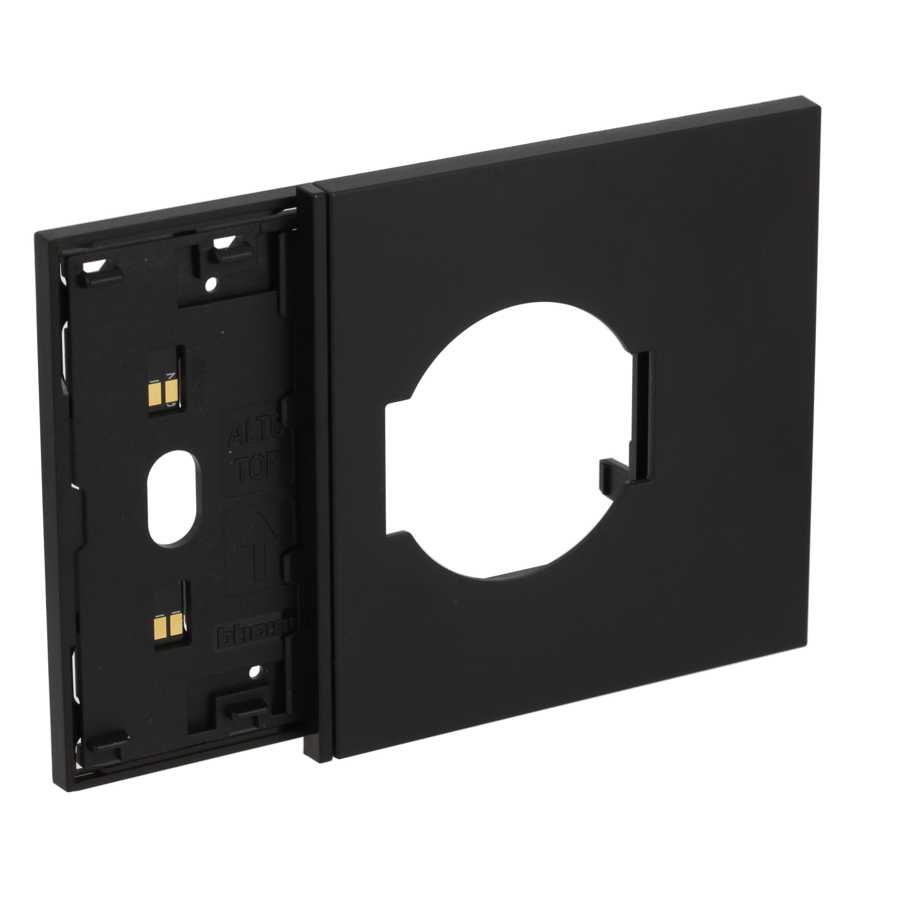 Frame elettrificato con mostrina presa standard italiano e tedesco, per l’installazione di 1 comando digitale e di una presa 2P+T (articoli compatibili: KG4140A16, KG4140A16F). Installazione in scatola da 3 moduli con supporto K4703. Colore nero.