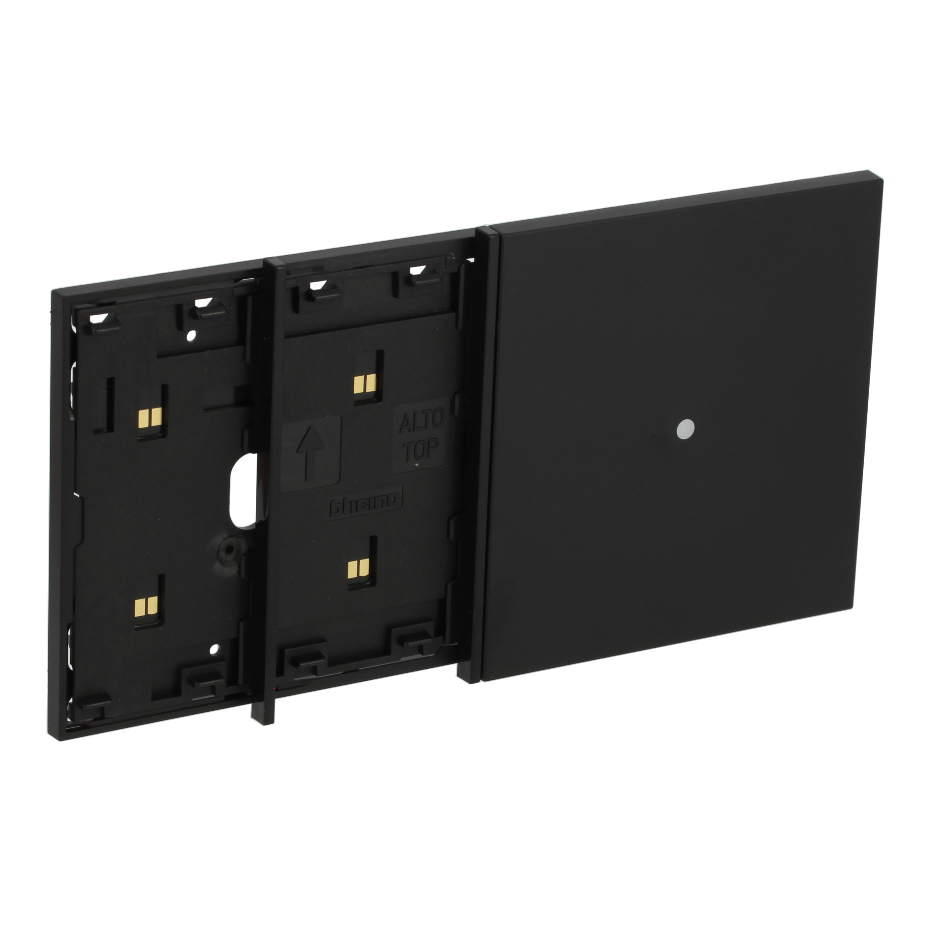 Frame elettrificato con mostrina lettore antifurto, per l’installazione di 2 comandi digitali e del lettore antifurto (art. K4215). Installazione in scatola da 4 moduli con supporto K4704. Colore nero.
