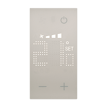 Sonda con display retroilluminato per il controllo della temperatura di una singola zona. È dotato di un ingresso per il collegamento di una linea contatti (es. contatto finestra). Permette la gestione di diverse tipologie di impianto e la regolazione della velocità della ventola in caso di impiego di fan coils. Possibilità di funzionamento automatico (estate/inverno) con impianti compatibili - 2 moduli, sabbia