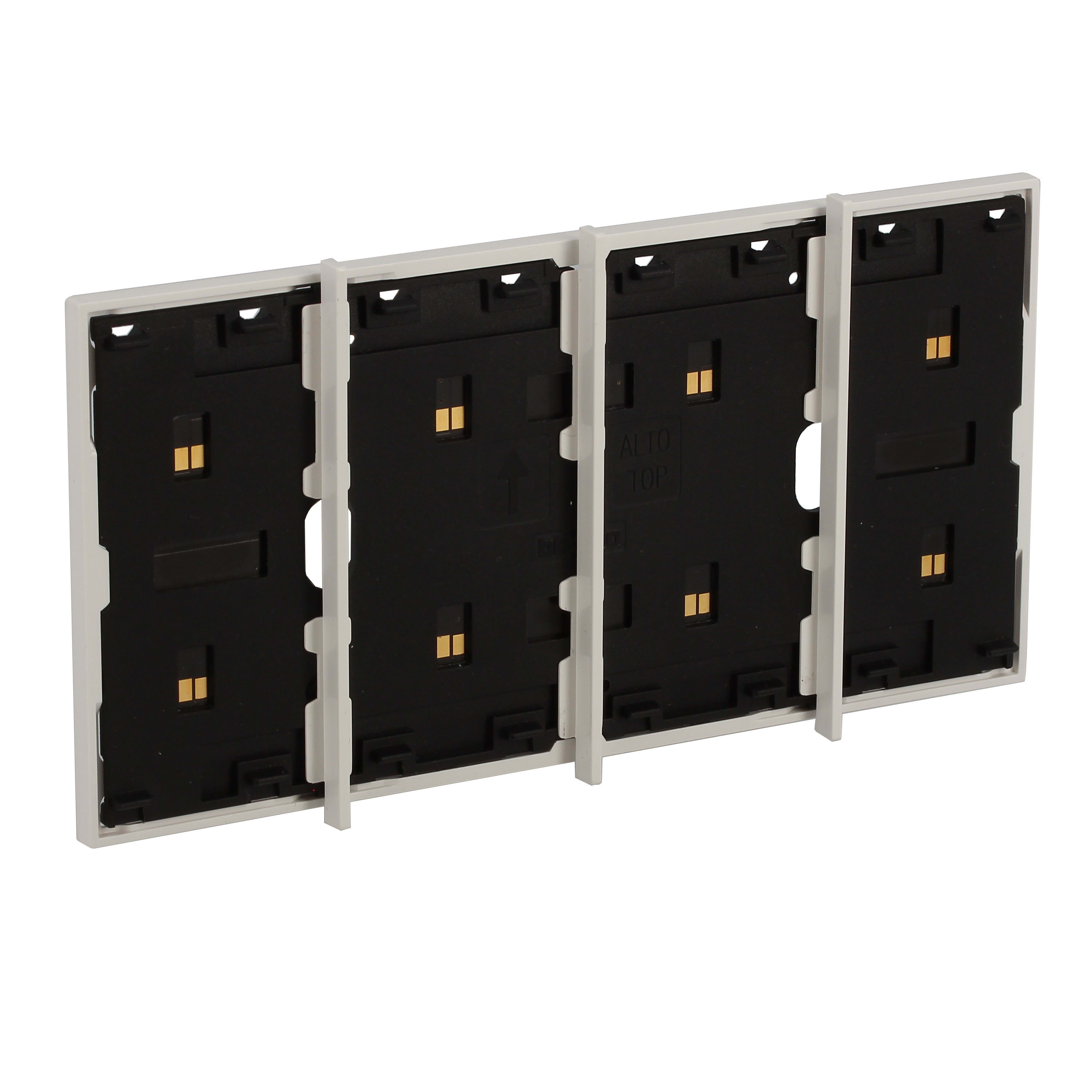 Frame elettrificato con barrette estetiche (rimovibili) di divisione tra i comandi. Per l’installazione di max. 4 comandi digitali o cover art. KW/KG/KM8100. Installazione in scatola da 3 moduli con supporto K4703. Colore bianco.