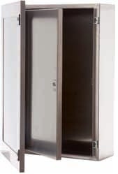 Cassetta composta da corpo, porta esterna trasparente, porta interna, piastra interna fissata sul fondo. • Con corpo in acciaio inox AISI304 satinato scotch brite sp. 12/10 pressopiegato e saldato • Porta trasparente in acciaio inox AISI 304 satinato scotch brite sp. 12/10 • Piastra interna in lamiera sp. 15-20/10 sendzimir • Guarnizioni, poliuretaniche applicate in colata continua • Cerniere reversibili con apertura 110° • Serratura con impronta doppia aletta • Grado di protezione IP 65 - TYPE 12
