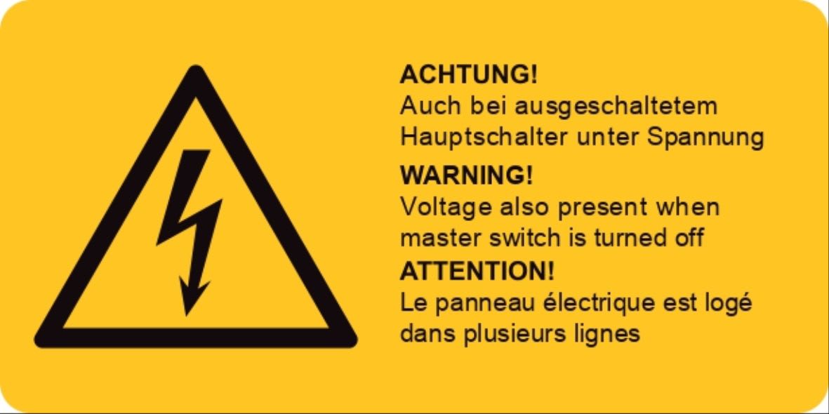 Composte dai simboli di avvertimento (WS) e con possibile integrazione di testo informativo (WST). Disponibili in formati diversi, permettono di segnalare in modo dettagliato ed efficace apparecchiature, macchinari ed impianti. Ilformato con testo e disponibile a richiesta in altre lingue