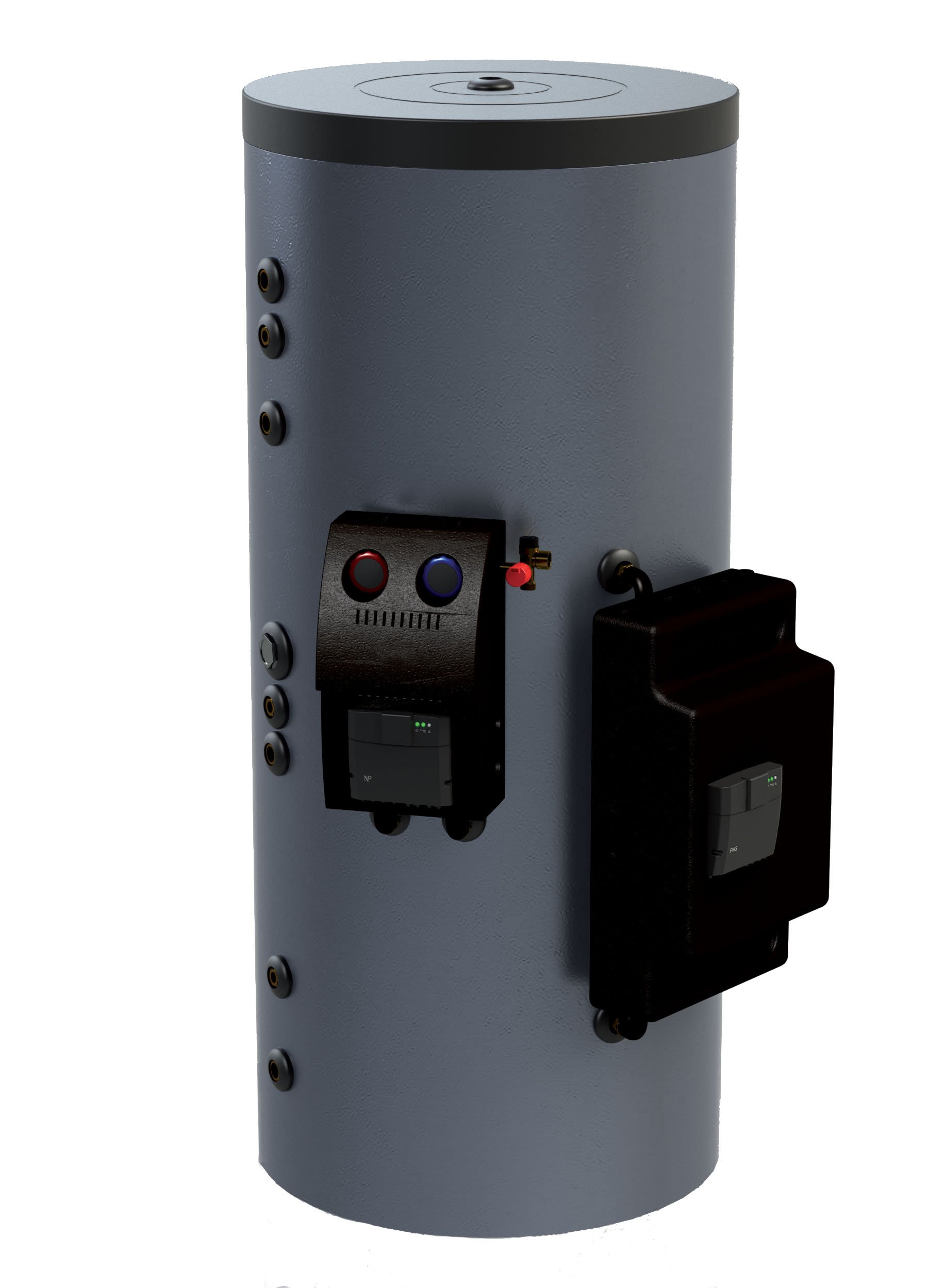Bollitore solare inerziale per produzione di acqua calda sanitaria tramite modulo istantaneo e integrazione agli impianti di riscaldamento.