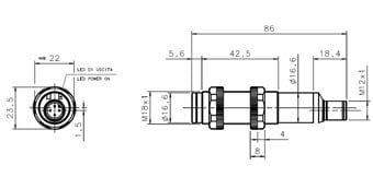 Fotocellula emettitore laser tipo 2 10/30Vcc. Formata tubolare plastico e MAXI. Connettori M12. E missioni IR per distanze operative di 40m.