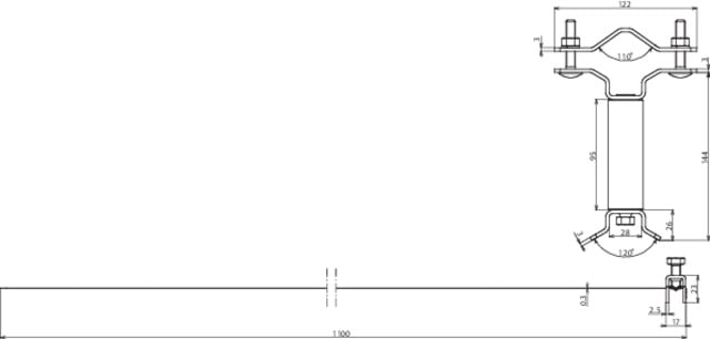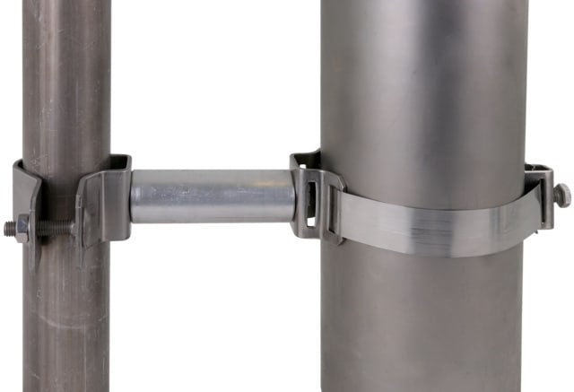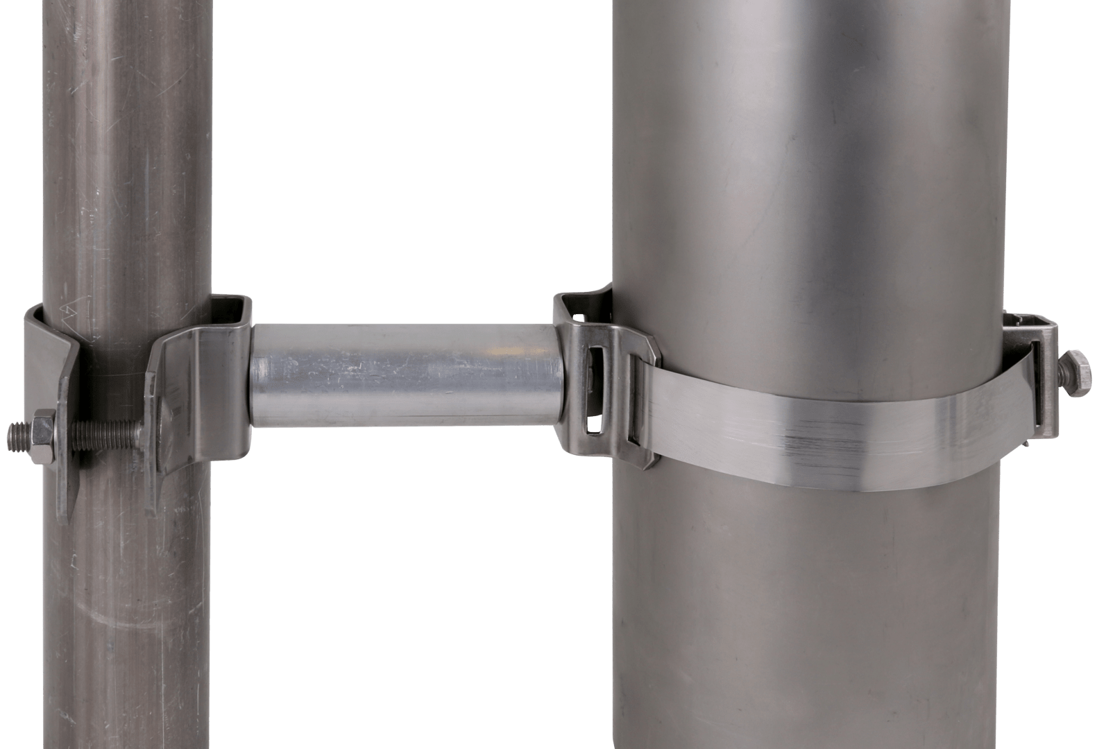 Collare di fissaggio a fascetta per il fissaggio dei tubi portanti DEHNiso-Combi ad es. sul palo portante d'antenna o altri tubi. Esecuzione con elemento distanziatore lunghezza 95 mm per bilanciare ad es. le staffe delle antenne.
