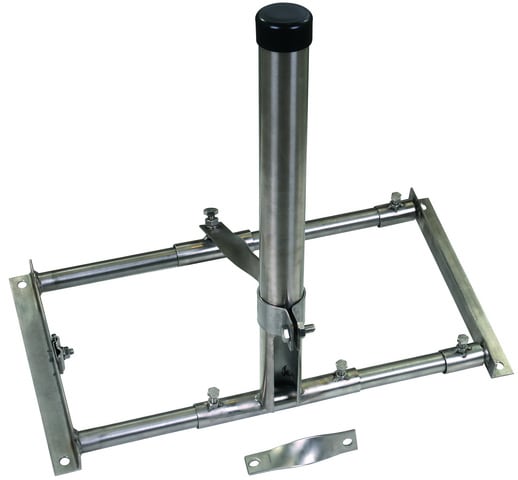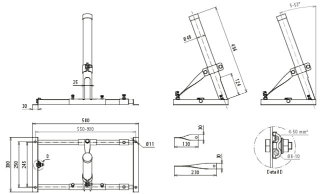 Puntone per tetti metallici per il fissaggio laterale di aste di captazione D40, tubi portanti HVI in PRFV/Al o in PRFV/INOX e montaggio opzionale con sopralzo di sistemi DEHNcon-H con posa interna del cavo. Supporto adatto per il montaggio verticale di dispositivi di captazione su tetti metallici fino a un'inclinazione massima del tetto di 53?.