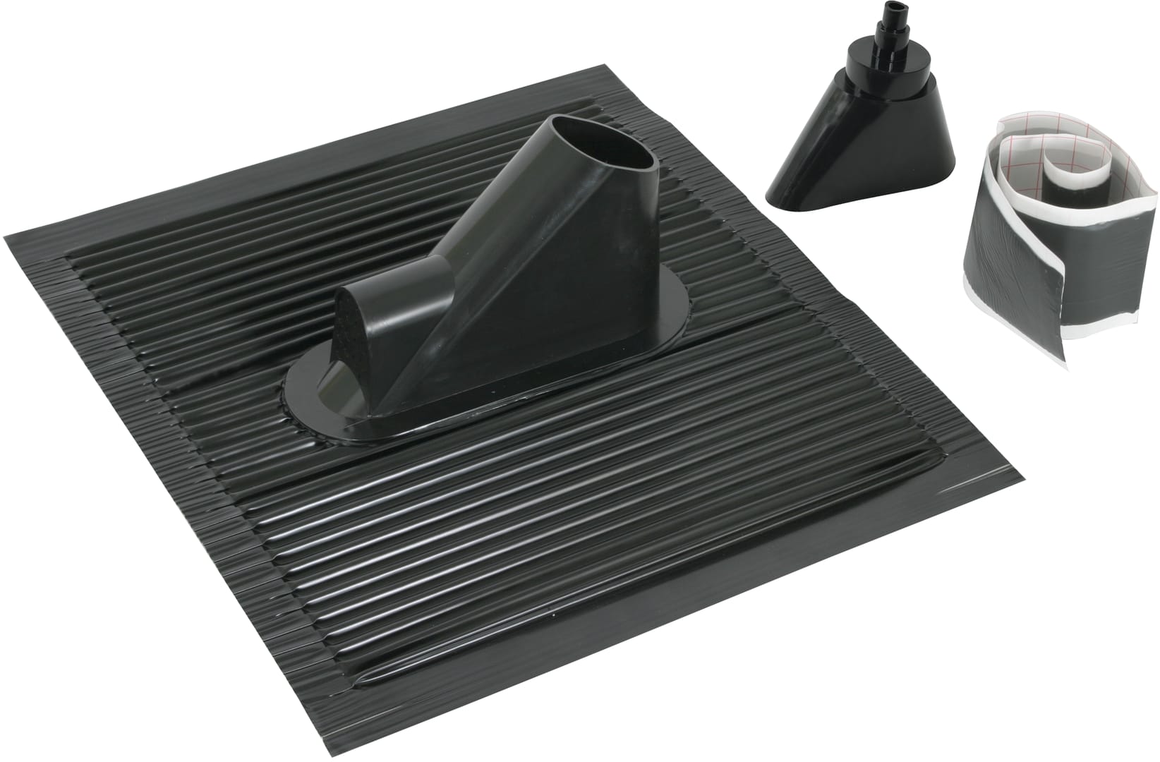 Set passante per tetti, per il passaggio e la sigillatura di pali e tubi (puntone) su tetti spioventi. Per l'applicazione universale su tegole / pietre differenti attraverso tegole deformabili in alluminio. Esecuzione in tegola di alluminio, colore nero,anello in gomma e nastro adesivo.