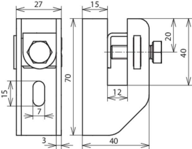 Staffa per conduttore piatto con piastra di pressione (vite M8), per la posa di conduttore piatto fino a 11 mm e conduttore tondo 6-10 mm, posa fissa del conduttore. Esecuzione con distanza parete di 15 mm.