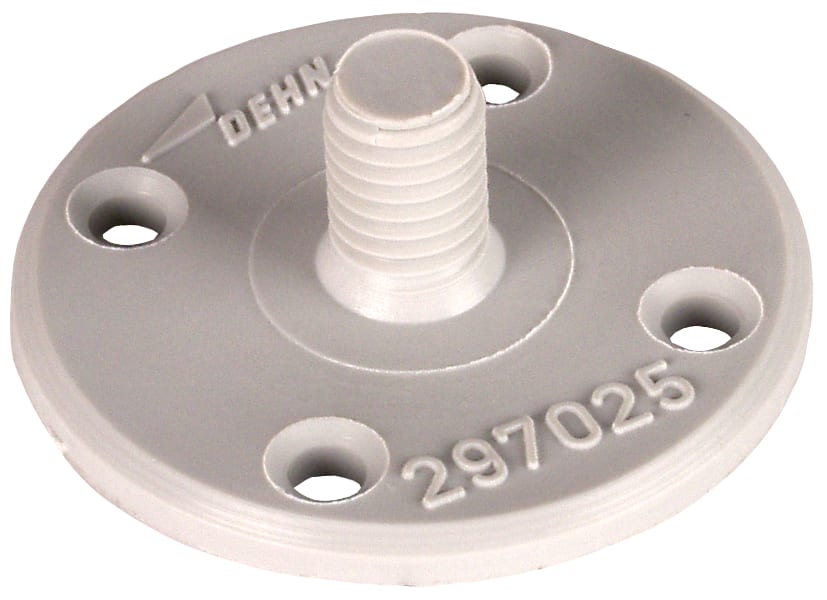 Piastra di fissaggio per montare impianti di captazione su tetti piatti e pareti. Esecuzione in plastica piccola, con filetto M8 per staffa portafilo ad es. DEHNsnap o DEHNhold.