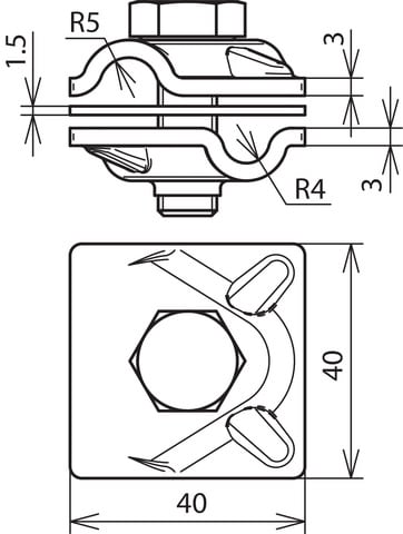 Morsetto di collegamento multiuso bimetallico secondo CEI EN 62561-1, per l'applicazione universale per connessioni a croce, a "T"e parallele di conduttori tondi. Esecuzione a tre componenti con vite a testa esagonale e filetto nella parte inferiore.