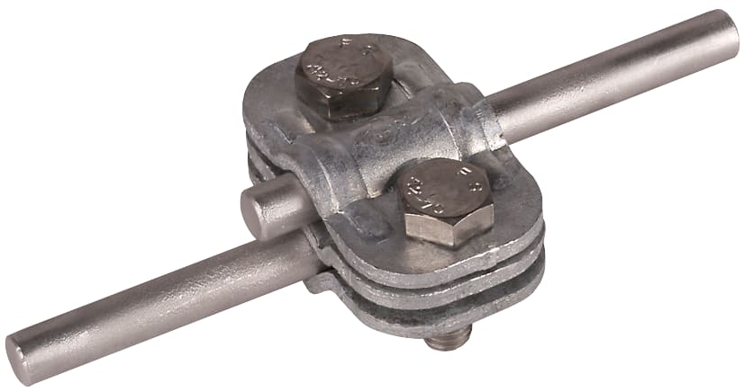 Morsetto di sezionamento UNI secondo CEI EN 62561-1 per il collegamento della calata con l’adduzione a terra. Esecuzione con piastra intermedia per due conduttori tondi, serie costruttiva stretta.