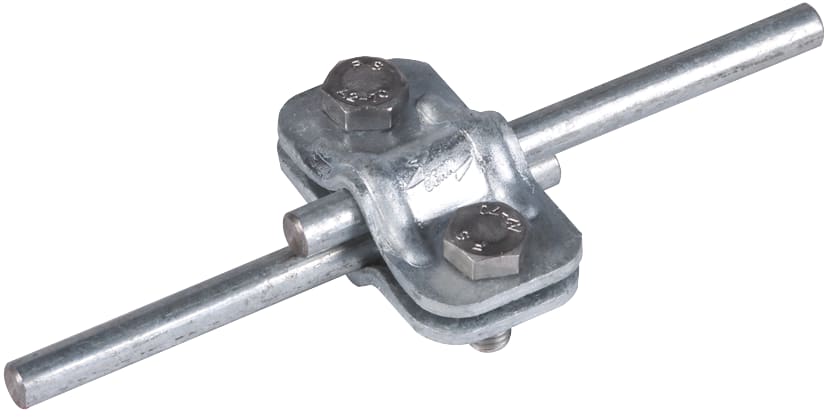 Morsetto di sezionamento UNI secondo CEI EN 62561-1 per il collegamento della calata con l’adduzione a terra. Esecuzione senza piastra intermedia per due conduttori tondi.