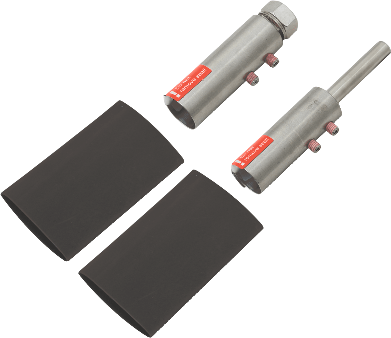 Elementi di connessione per attestare la conduttura HVI long, per la realizzazione delle connessioni della conduttura sul tubo portante (elemento terminale per piastra di connessione) ed elemento di connessione per collegare ad altri componenti della protezione esterna da fulmini o dell'impianto di terra (sono compresi nella confezione due tubi termorestringenti e quattro fascette).