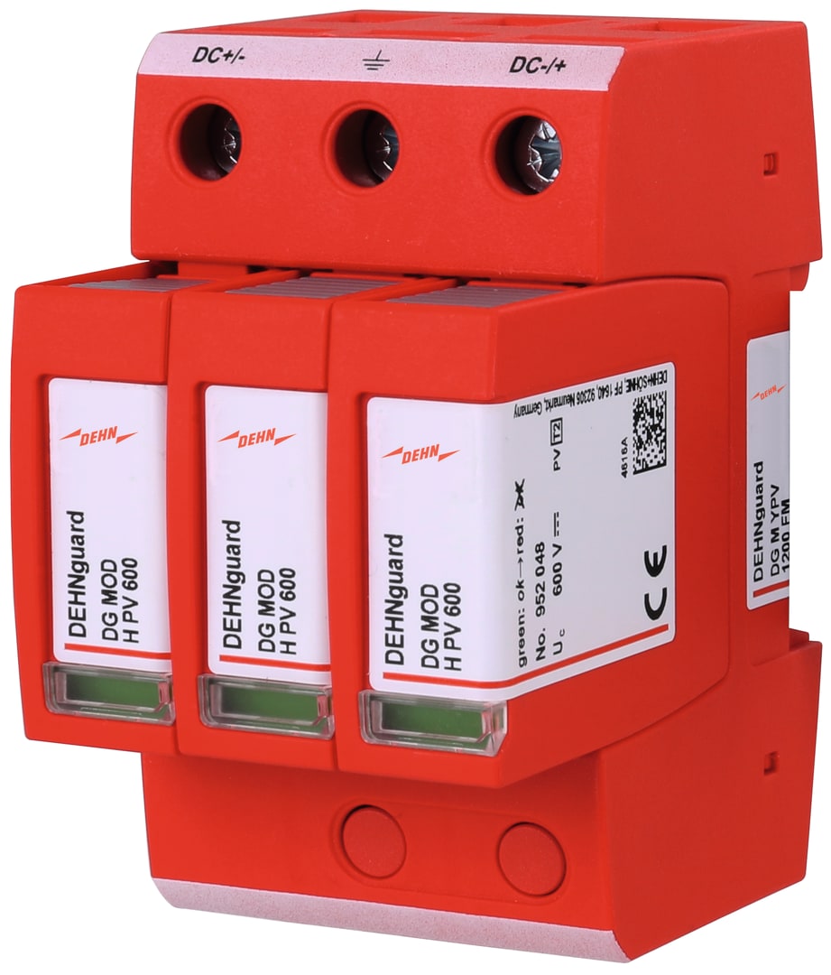 Limitatore di sovratensione multipolare DEHNguard M YPV SCI, Tipo 2 secondo EN 50539-11 con dispositivo di manovra in corrente continua a tre gradini, composto da base e moduli di protezione innestati. Elevata sicurezza del dispositivo per mezzo del controllo a distanza. Per la protezione da sovratensione di impianti elettrici utilizzatori in bassa tensione. Per l'utilizzo secondo IEC 60364-7-712:2002-05 (realizzazione di impianti elettrici utilizzatori fotovoltaici).